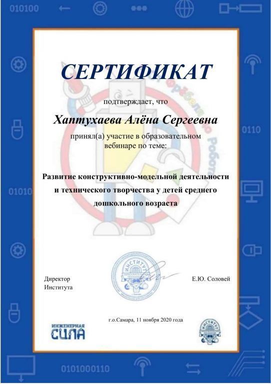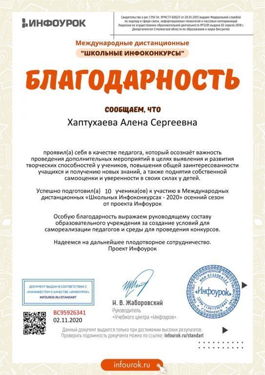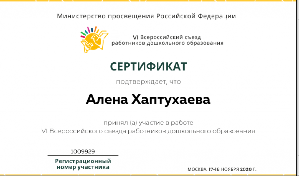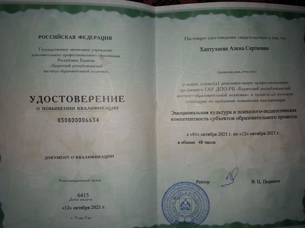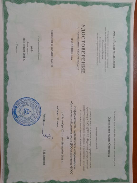Присвоенная квалификация по диплому: "Воспитатель детского сада." "Педагогическое образование."